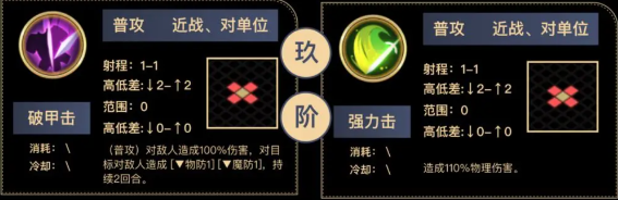 1.穿甲打击:对敌人造成100%伤害,并对目标敌人造成物理防御伤害,持续2回合;