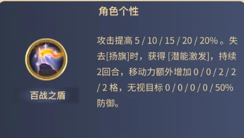 失去【旗帜】时,获得【潜在灵感】,持续2回合,移动力额外增加0/0/2/2/2格。