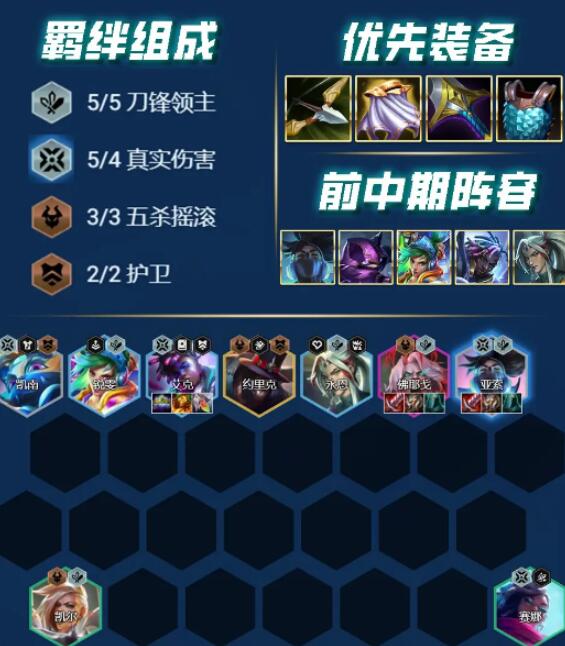 羁绊:5刀锋领主、4真实伤害、3五杀石、2守卫