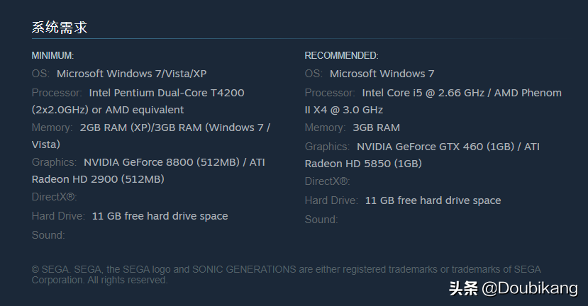 可见《SonikGeneration》对硬件的要求并不高。如今,低配置的电脑也能流畅运行这款游戏。