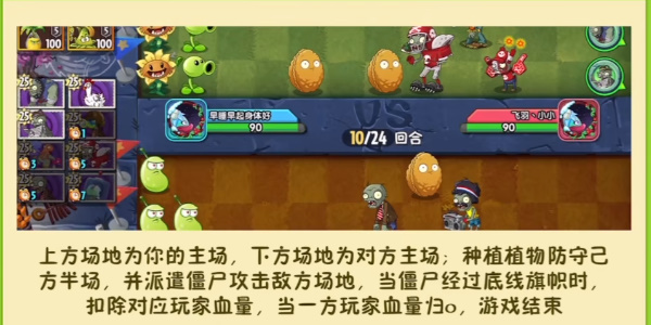 4、上场为己方主场,下场为对方主场。种植植物来保卫己方阵地,并派出僵尸攻击敌方阵地。当僵尸越过底线旗帜时,血量就会被扣除。当一名玩家的血量归零时,游戏结束。