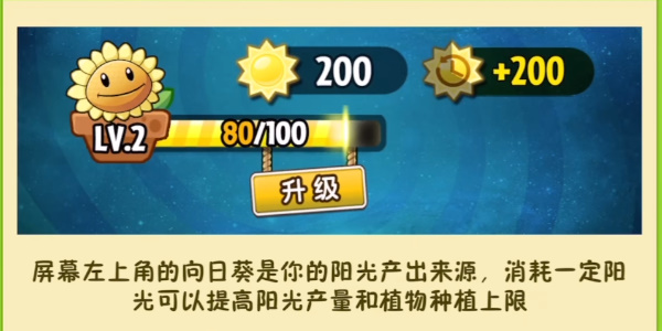 5. 屏幕左上方的向日葵是阳光产生的来源。消耗一定量的阳光可以提高阳光产量和植物栽培的上限。