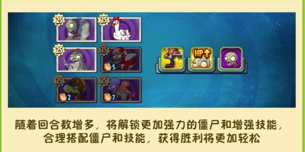 6.随着回合数的增加,将会解锁强大的僵尸和强化技能。玩家可以通过合理的搭配僵尸和技能轻松获胜。