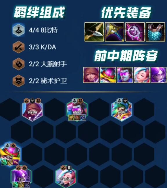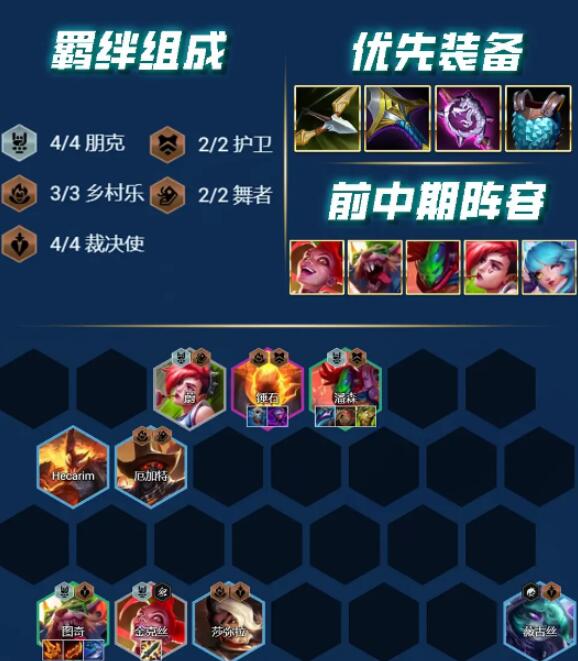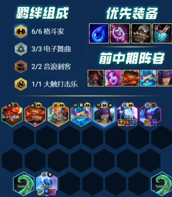 羁绊:6 个战士、3 个电子舞曲、2 个声音刺客、1 个Big Touch 打击乐手