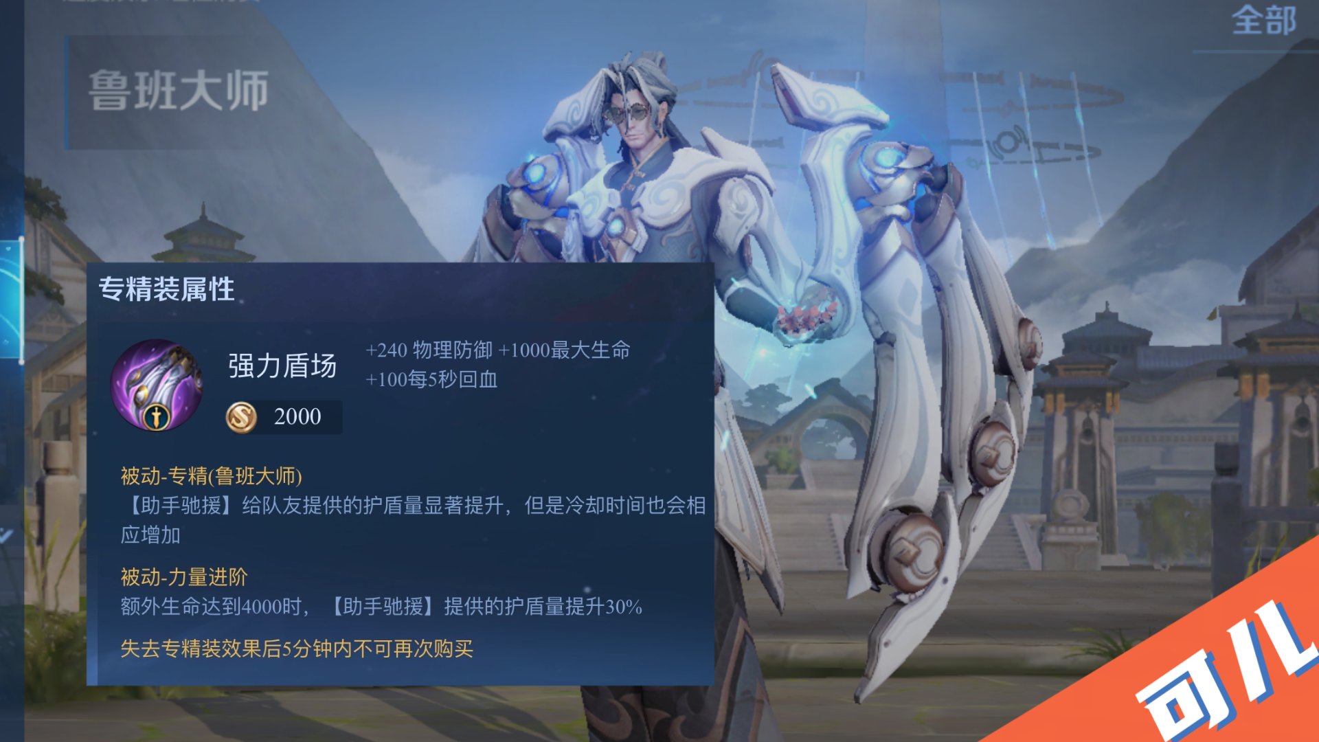 七件专用装备中,只有鲁班大师的装备是完全无法生产的。这个装备完全没用。对于鲁班大师来说,晋升护盾的用处不大。他的二技能的作用是让队友移动到安全位置进行输出,而不是为队友提供护盾。