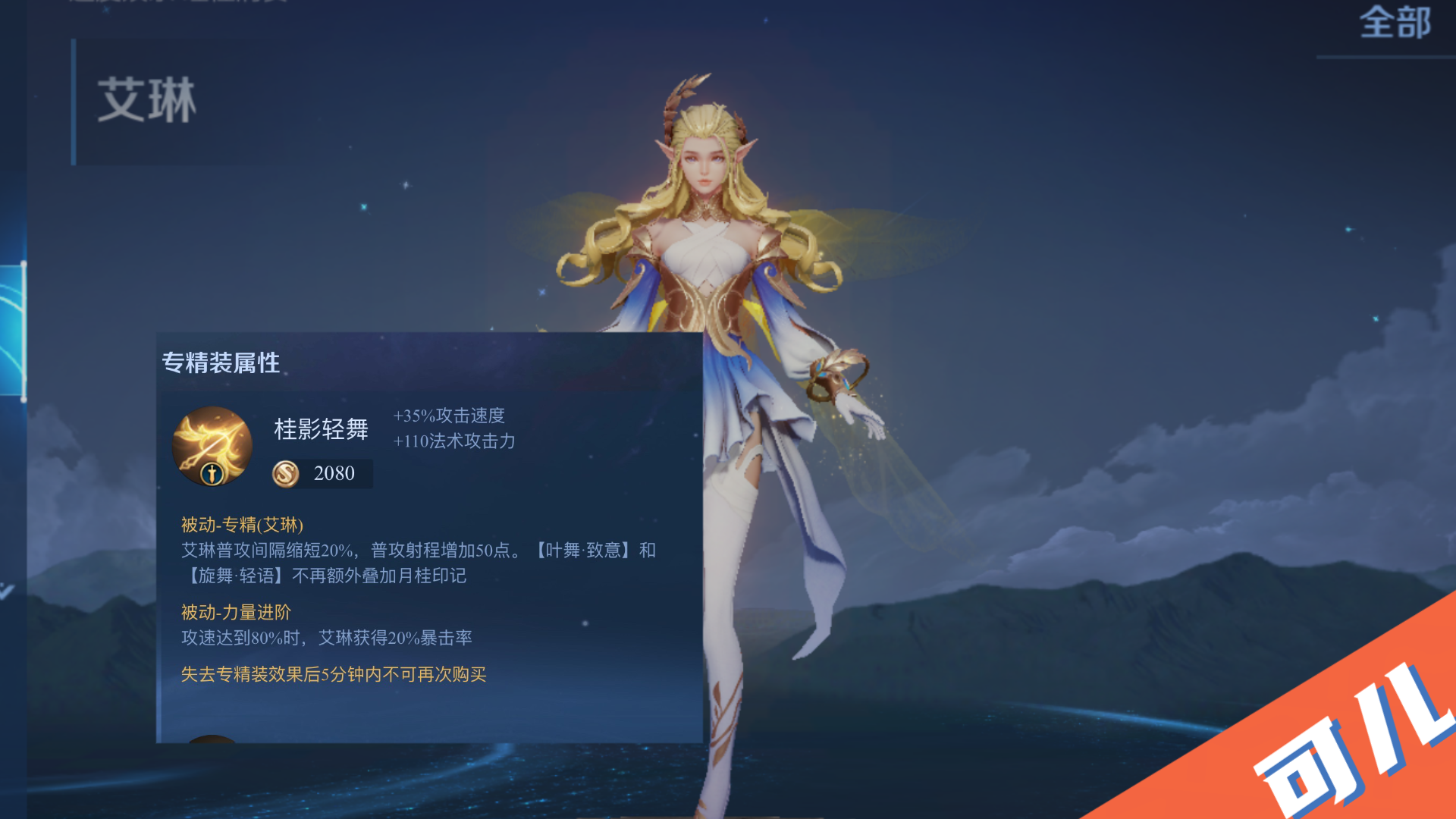 艾琳:普通攻击间隔缩短20%,射程增加50点。不过,第一技能和第二技能不能叠加。攻击速度达到80%,暴击率提高20%。