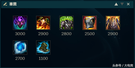 塞恩使用了暗影拳首选的赤裸深渊面具,不但可以增加魔法抗性,还可以增加E、W的伤害,可谓一石二鸟。然后就可以晒黑帮忙推线,然后不假思索地堆上肉。