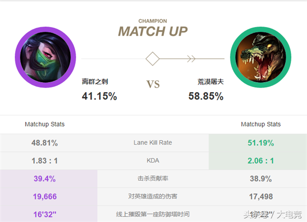 Desert Butcher 在美国和韩国服务器的统计数据非常相似。暗影拳与鳄鱼的胜率只有42%左右。鳄鱼队不仅可以打单打,而且打单打也是一个可行的选择。是一个可以同时克制中路的阿卡丽。鳄鱼在线击杀率和KDA领先于暗影拳,但击杀贡献率和英雄伤害稍稍落后。简单来说,鳄鱼有线上优势很容易被击败,但如果平衡的话,中期暗影拳就有优势。