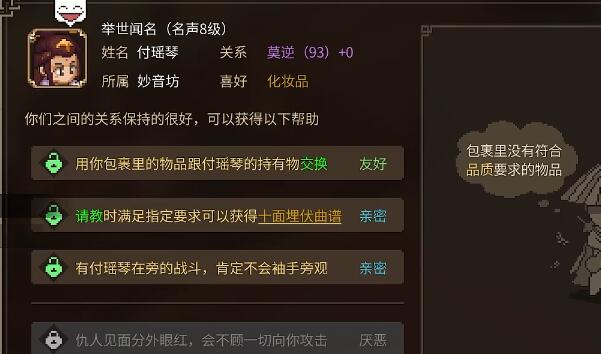 以上就是傅瑶琴的结婚之法的介绍。玩家需要帮助付瑶琴提升功力,消灭三教。希望对各位玩家有所帮助。