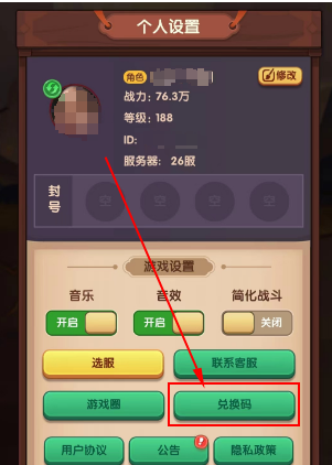 3、跳转到个人设置页面,选择兑换码,点击下方;