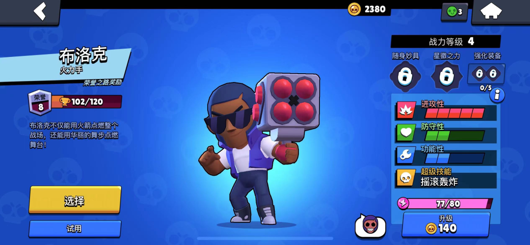 “火箭筒”布洛克也是远程输出角色,生命值和移动速度与柯尔特相同。他的基础攻击是火箭弹,射程远,威力大,命中后范围伤害大。然而,火箭飞行速度缓慢,需要很长时间才能重新装弹。玩家必须掌握足够的预测和瞄准技巧才能善用它们。如果他们一味地捕鸟,他们只会配备远程桨。