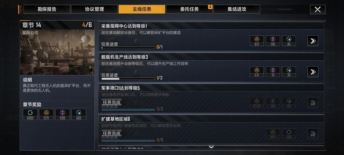 另外,在采集指挥中心任务出现之前,最好先完成所有主要任务,防止资源不足。但出现采集指挥中心任务后,该任务可以省略。第一是低级挖矿平台实在没什么用;二是后续主线任务的奖励比较少,但是升级建筑又消耗大量金钱,所以没有继续下去的必要。