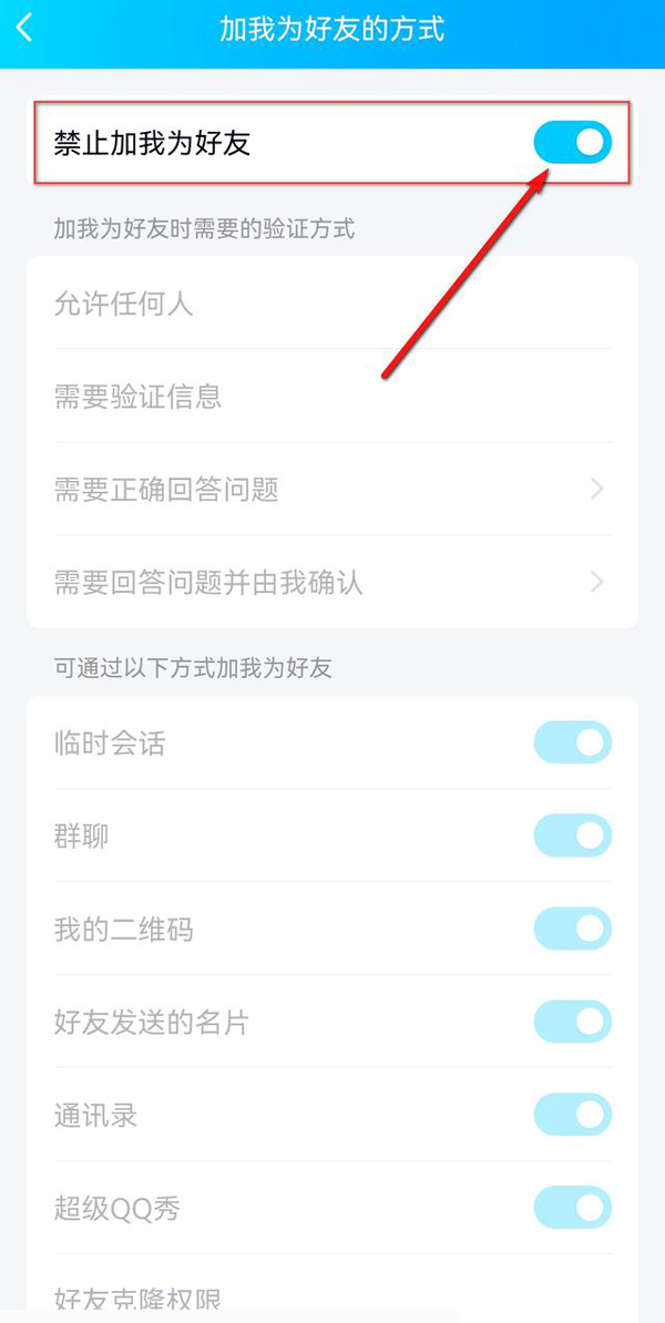 4、当“禁止加我为好友”旁边的小滑块亮起时,表示此时您不能加我为QQ好友。点击小滑块,勾选加我为好友时需要的验证方式,并启用。只需加我为好友即可。