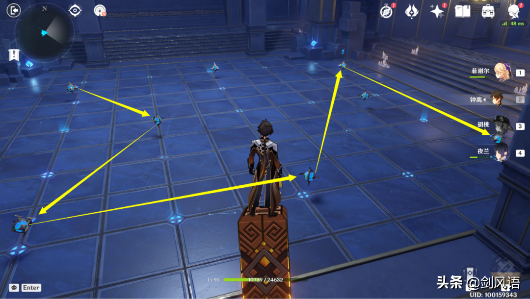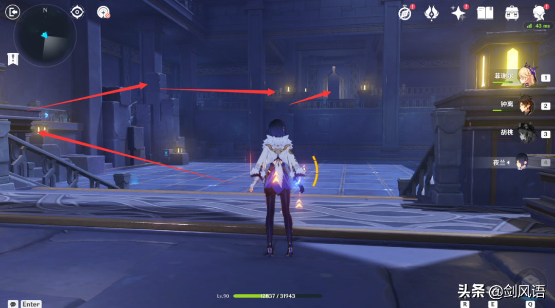 7、同样,先关闭前面连接的灯,按照下图操作,将机关转动到箭头方向,然后攻击机关点亮即可完成精美宝箱的获取。与此同时,对面的墙壁上,也出现了第四张星图。