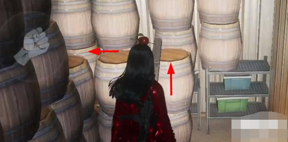 5.然后我们爬上楼梯尽头的酒桶,沿着钢管前进。