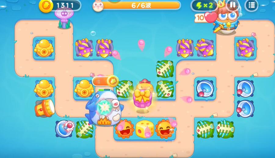 2.摧毁宝箱获得章鱼,升级它帮助我们守卫家园,在章鱼左侧再建一个鱼骨攻击左侧的障碍物。