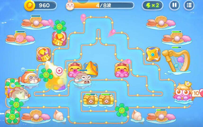 2.在左上方建造火焰喷射器,补充对兔子的伤害。同时,摧毁宝箱,得到一只章鱼,对周围的障碍物造成伤害。
