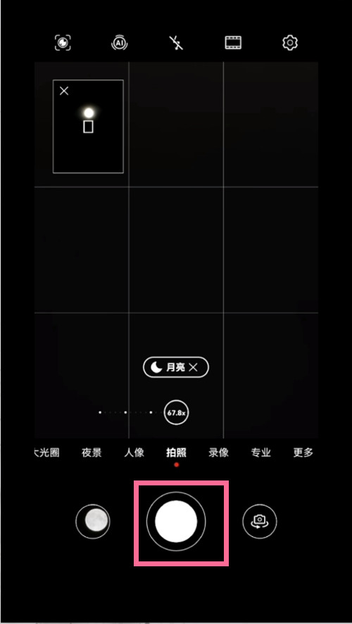 3.将镜头对准月亮,将两根手指张开在屏幕上,放大图片,放大到10倍或以上自动进入月亮模式,然后单击拍摄按钮。