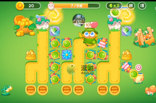 9、最后一波,在左侧道路下方放置三个龟塔,攻击道路上的障碍物。