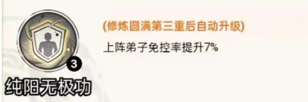纯阳无极功夫,属于师父的技艺。可以在大师洞窟中查看和升级。它不需要佩戴。弟子战斗中不受控制率提升5%。升级完成后,免控率提升10%。活动结束后仍然有效。