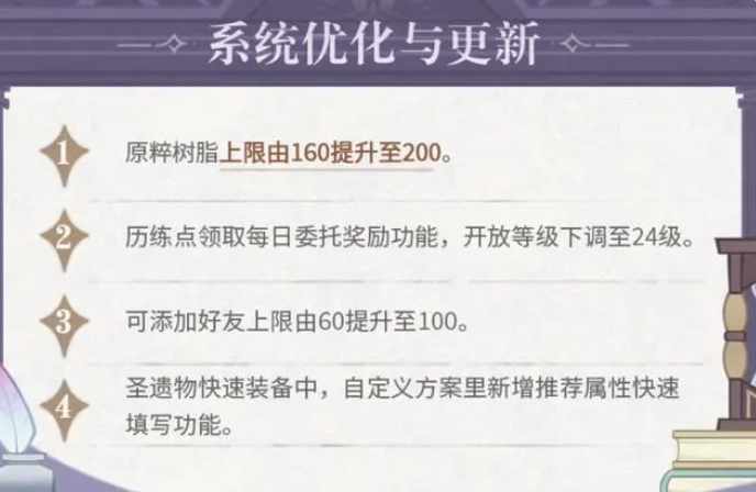 随后,本次系统又进行了优化和细化。体力上限提升至200,但恢复速度保持不变。领取经验值的功能降低至24级,好友上限提高至100人。最后,在圣物快速装备中,新增了快速填写定义计划中推荐属性的新功能。