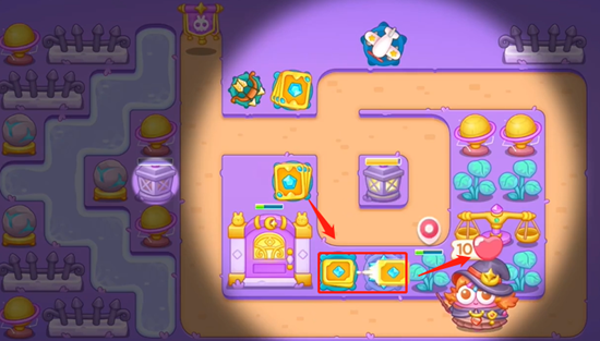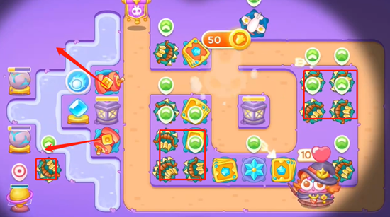 在《阿宝与法宝》的66关中,有一个区域有很多不在沿线的道具,所以我们需要做额外的安排来清理道具。本关卡可以使用的炮塔有鞭炮、多箭、卡牌和忍者飞镖等。