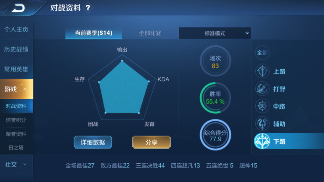 2、根据击杀数、死亡数、助攻数、团队参与率、输出值、推塔值、辅助值、伤害转化率进行评分。