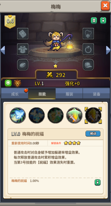 技能效果:进行普通攻击时,会给自身带来增加闪避率的buff效果。每次释放普通攻击,当3号技能的【祝福】效果消失时,累积的增益效果将会被重置。