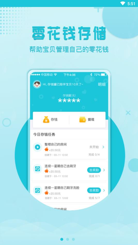 电子智能存钱罐是一款可以让您网上省钱、养成好习惯的APP。可以绑定银行卡。在这里完成家长设定的各种小任务就可以赚取星星,星星可以兑换相应的奖励。这个APP是亲子成长互动的见证。如果父母用奖励的方式让孩子完成任务,他们也会养成很多好习惯。按时做作业、打扫卫生、做饭等都是培养孩子的方法。